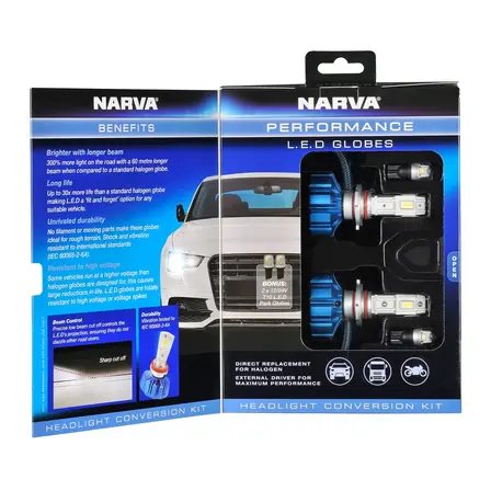 Providing up to 300% more light on the road and a 60 metre longer beam than standard halogen globes, Narva Gen III LED performance globes offer unrivalled headlight performance. The LED globes last up to 30 times longer than their halogen counterparts, making them a true ‘fit and forget’ option. With no filament or moving parts, Gen III LED performance globes are ideal for rough terrain. Includes a set of T10 LED wedge park globes to complete the LED look. Not ADR approved - for off road use only.